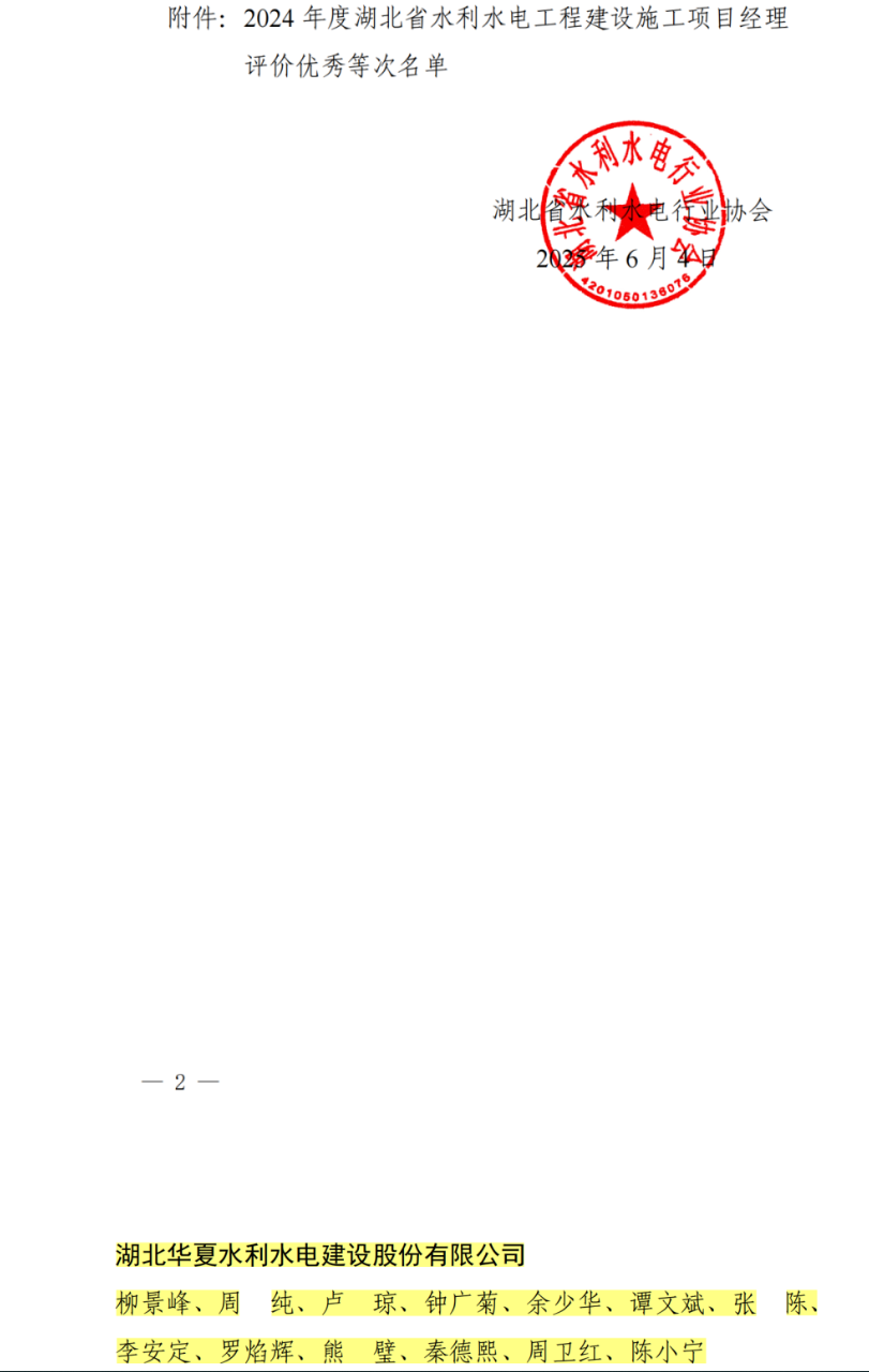 在2024年度湖北省水利水電工程建設施工項目經理評價工作中,湖北華夏水利水電股份有限公司創佳績!本次公司13名項目經理成功獲評優秀等次,通過率高達86.7%,獲評人數創公司歷史新高!