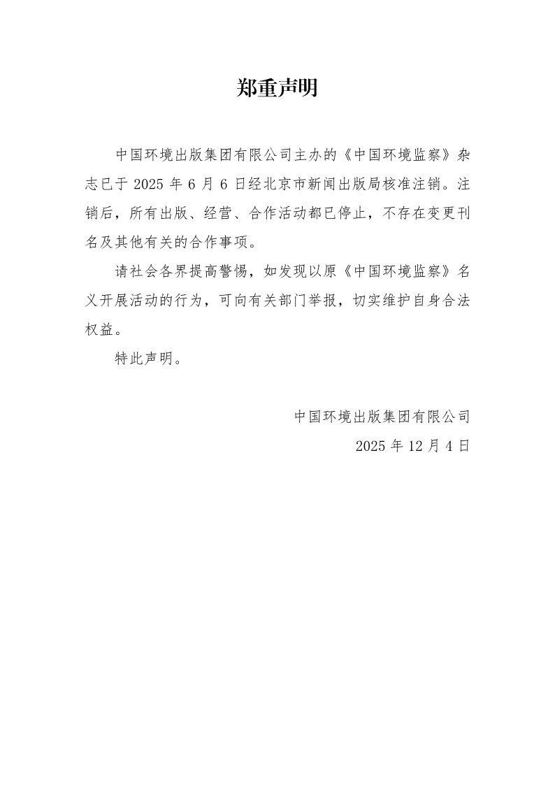 中國環(huán)境出版集團(tuán)有限公司主辦的《中國環(huán)境監(jiān)察》雜志已于2025年6月6日經(jīng)北京市新聞出版局核準(zhǔn)注銷。
